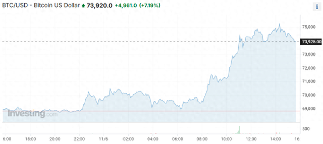 截至北京时间下午14点24分,全球最大的数字资产比特币涨幅高达9%,最高飙升到75,252美元。据悉,比特币的上一个峰值出现在今年3月,当时投资者因资金流入专门的美国交易所交易基金(ETF)而欢欣鼓舞。