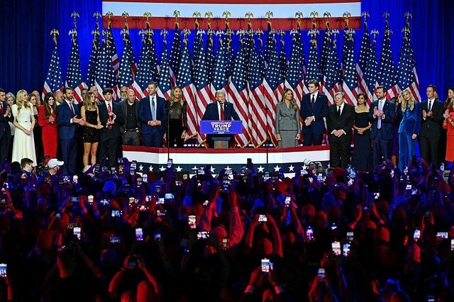 当地时间6日凌晨,特朗普在佛罗里达州棕榈滩会议中心发表讲话,宣布在2024年总统选举中获胜。